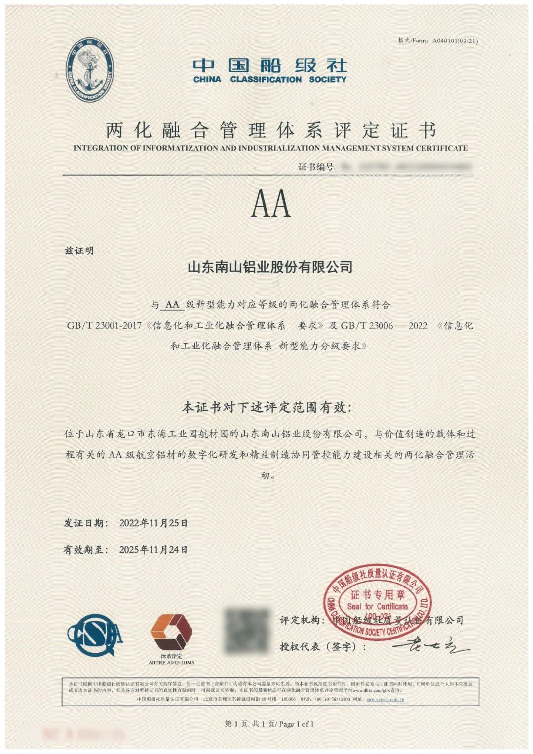近日,山東南山鋁業(yè)股份有限公司完成兩化融合管理體系由“A”升級至“AA”級認(rèn)證,促進(jìn)了南山鋁業(yè)從傳統(tǒng)企業(yè)轉(zhuǎn)型升級,加快了戰(zhàn)略目標(biāo)落地,在彰顯南山鋁業(yè)綜合實力的同時,也推動了企業(yè)品牌影響力的傳播。