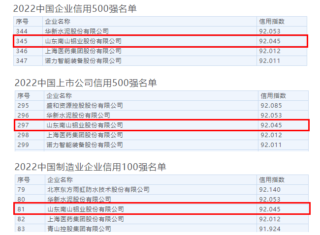 論壇上發(fā)布了《中國企業(yè)信用發(fā)展報(bào)告2022》,這是中國企業(yè)改革與發(fā)展研究會、中國合作貿(mào)易企業(yè)協(xié)會自2011年以來連續(xù)第12次向社會發(fā)布。發(fā)布了2022年度中國企業(yè)信用500強(qiáng)、中國制造業(yè)企業(yè)信用100強(qiáng)、中國服務(wù)業(yè)企業(yè)信用100強(qiáng)、中國民營企業(yè)信用100強(qiáng)、中國上市公司信用500強(qiáng)等系列榜單,南山鋁業(yè)憑借多年來良好的信用體系位列“2022中國企業(yè)信用500強(qiáng)”第345位、“2022中國上市公司信用500強(qiáng)”第297位、“2022中國制造業(yè)企業(yè)信用100強(qiáng)”第81位。