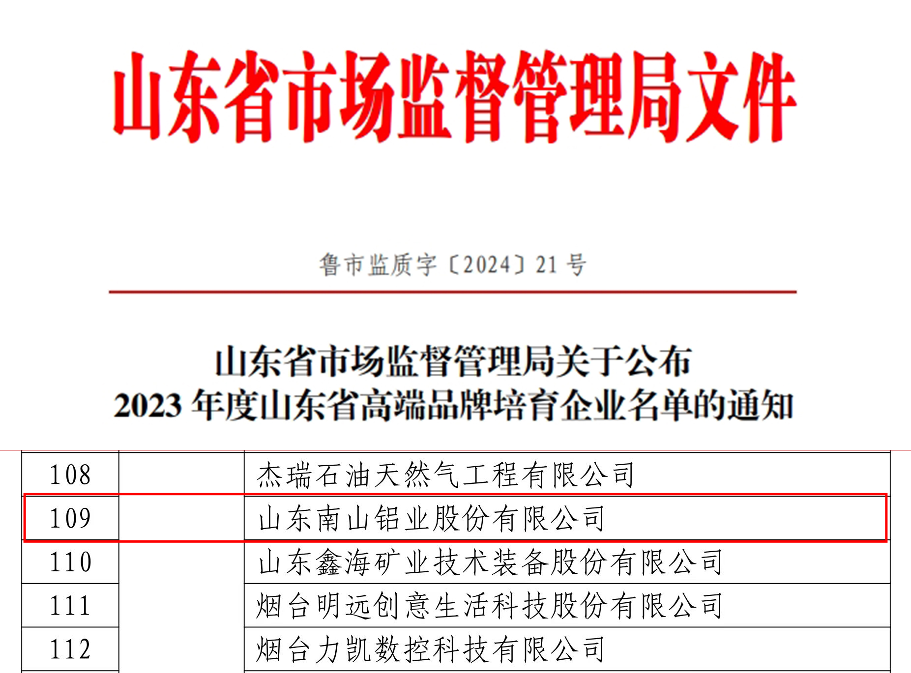 近日,山東省市場(chǎng)監(jiān)督管理局公布2023年度山東省高端品牌培育企業(yè)名單,山東南山鋁業(yè)股份有限公司榮譽(yù)上榜。