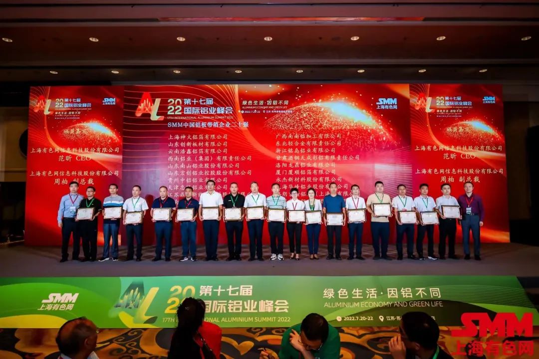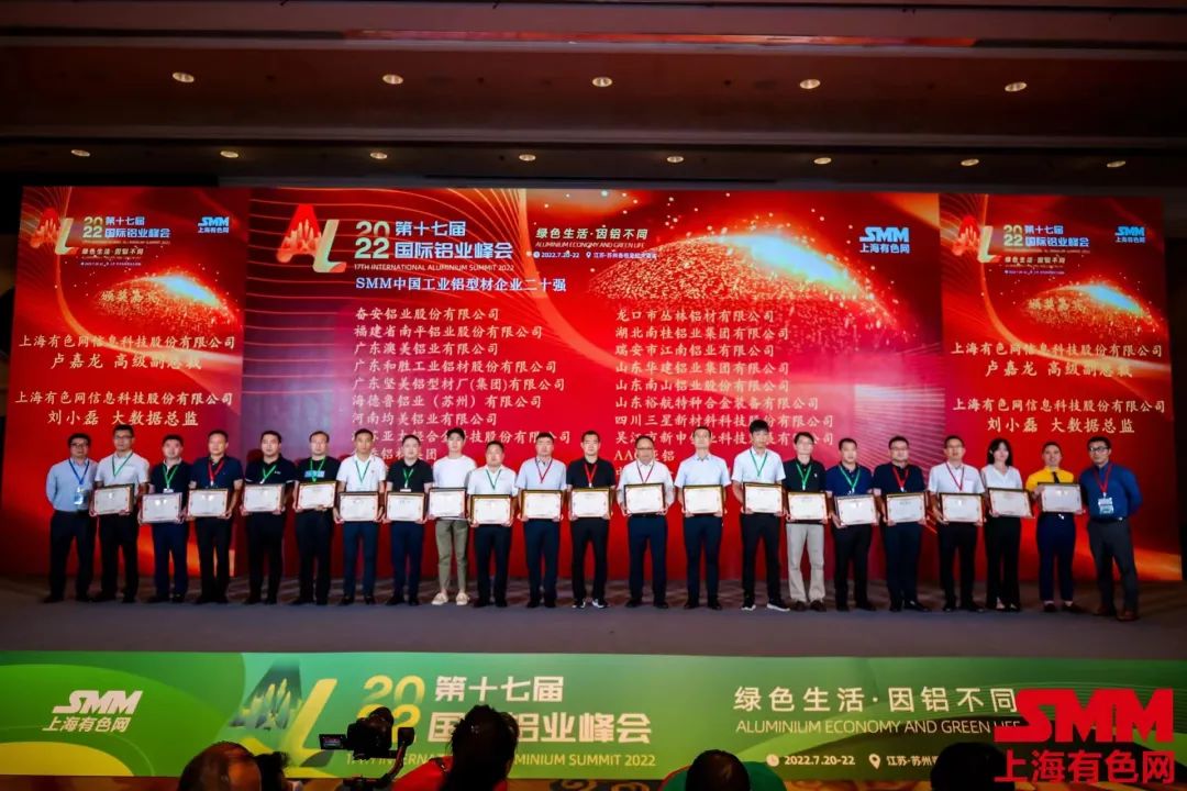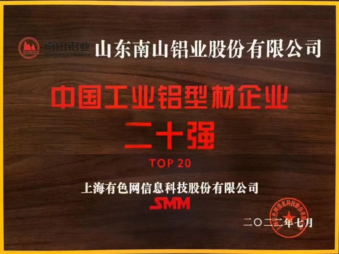 7月20日-22日,2022年SMM(第十七屆)國際鋁業(yè)峰會在江蘇蘇州舉行。山東南山鋁業(yè)股份有限公司旗下鋁材公司和板帶事業(yè)部分別獲得“中國工業(yè)鋁型材企業(yè)二十強(qiáng)”和“中國鋁板帶箔企業(yè)二十強(qiáng)”榮譽(yù)稱號。