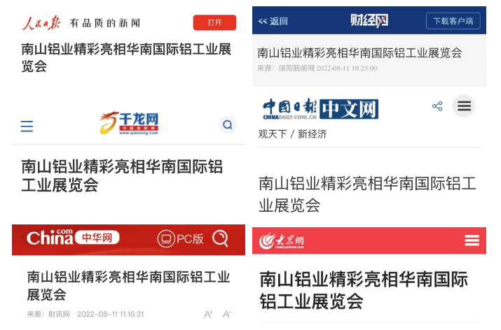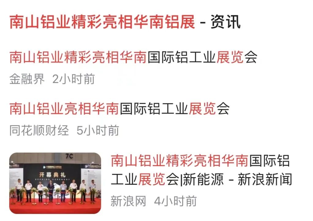 作為中國鋁加工行業(yè)的骨干企業(yè),南山鋁業(yè)亮相2022年華南國際鋁工業(yè)展覽會,受到各大主流媒體的關(guān)注。8月11日,中國日報(bào)、中華網(wǎng)、人民網(wǎng)、鳳凰網(wǎng)、鳳凰衛(wèi)視、山東衛(wèi)視、財(cái)經(jīng)網(wǎng)、中國經(jīng)營網(wǎng)、新浪網(wǎng)、大眾日報(bào)等多家媒體聚焦南山鋁業(yè)亮相華南鋁展的高光時(shí)刻!