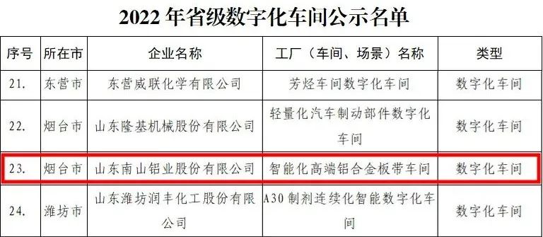 近日,山東省工業(yè)和信息化廳公布2022年省級(jí)數(shù)字化車間名單,山東南山鋁業(yè)股份有限公司“智能化高端鋁合金板帶車間”榜上有名。